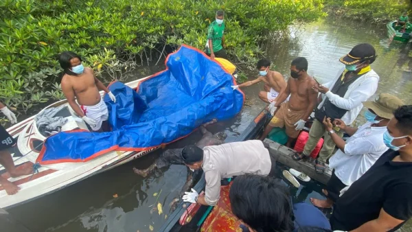 Setelah dipastikan, mereka menemukan jasad laki-laki mengapung lalu mengikat kaki korban ke akar bakau agar tidak hanyut sebelum melaporkannya ke aparat desa dan kepolisian.