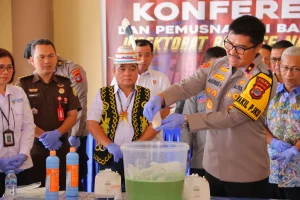 TANJUNG SELOR – Wakapolda Kalimantan Utara Brigjen Pol. Andries Hermanto, S.I.K., S.H., M.Si., memimpin kegiatan pengungkapan kasus tindak pidana narkotika sekaligus pemusnahan barang bukti di