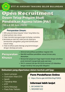 BulunganKaltara STIT Al-Anshar Tanjung Selor Buka Rekrutmen Dosen Tetap Prodi PAI Tahun 2025 redaksi Senin, 9 Juni 2025 TANJUNG SELOR, STIT Al-Anshar Tanjung Selor Bulungan membuka kesempatan bagi putra-putri terbaik bangsa untuk bergabung sebagai Dosen Tetap Program Studi Pendidikan Agama Islam (PAI). Rekrutmen